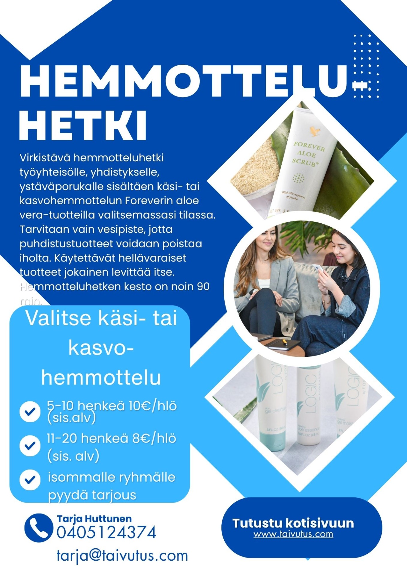 Hemmotteluhetki sopii yritysten tyhy-ohjelmaksi, työyhteisöjen virkistyspäiviin sekä järjestöjen ja yhteisöjen tapahtumiin virkistäväksi ohjelmanumeroksi. Hemmotteluhetkeä varten tarvitaan tila, jossa on pöytä ja istuimia sekä ainakin yksi vesipiste. Ryhmä voi valita, tehdäänkö hemmottelu käsille vai kasvoille. Hemmottelussa käytetään Foreverin aloe vera-pohjaisia tuotteita, jotka ovat hellävaraisia ja sopivat kaikille ihotyypeille. Tuotteita voi halutessaan myös ostaa tilaisuuden lopuksi, mutta ostopakkoa ei tietenkään ole.