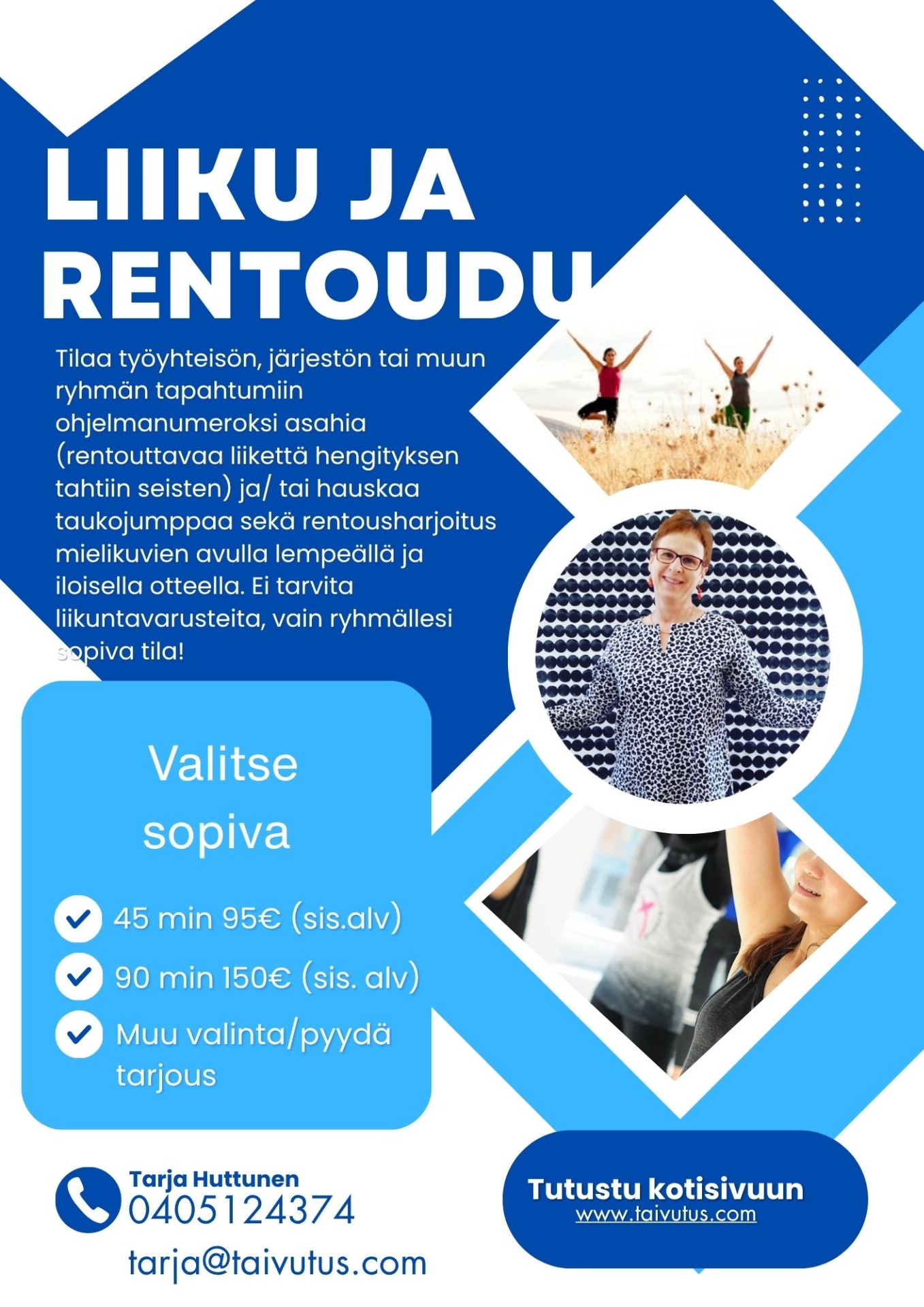 Tämä liikunnallinen ohjelmatuokio sopii sekä yrityksen tyhy-päivään että järjestön tai muun ryhmän tapahtumaan. Sisältö muokataan aina kullekin ryhmälle sopivaksi: se voi olla kehoa ja mieltä hellivää asahia, mielikuvituksellista tuolijoogaa, hauskaa taukojumppaa tai lempeää rentoutusta. Kerro toiveesi ja millainen tila on käytettävissä, niin muokkaan ohjelmaa tarpeen mukaan.